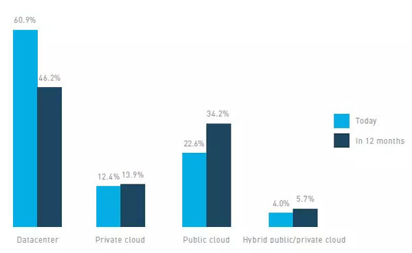 许多企业在逐渐远离其数据中心,将应用工作负载积极迁移到公共云。据CSA的调查报告显示,2016年,60.9%的应用工作负载仍驻留在企业数据中心。然而到2017年年底,不到一半(46.2)的应用工作负载仍留在企业数据中心。这一方面归因于新的应用系统主要部署在云端,还有个原因是企业计划将20.7%的现有应用系统迁移到公共云。