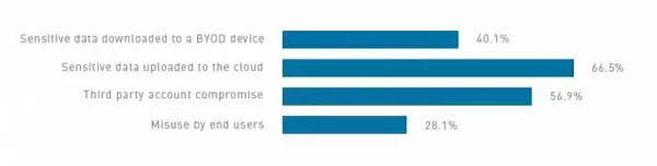 CSA报告还发现,被问及在公共云运行的应用系统面临的最大威胁时,最常见的一个回答(66.5%)是上传到云端的敏感数据。一些企业组织面临法规遵从和数据驻留等方面的要求,可能阻止无法将数据上传到云环境。