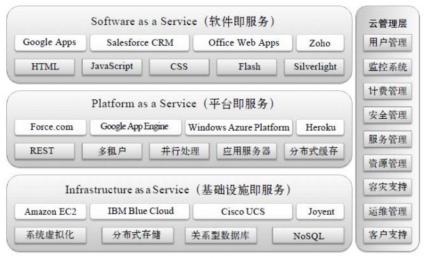 云计算架构分为服务和管理两大部分。在服务方面,主要以提供用户基于云的各种服务为主,共包含3个层次:基础设施即服务IaaS、平台即服务PaaS、软件即服务SaaS。在管理方面,主要以云的管理层为主,它的功能是确保整个云计算中心能够安全、稳定地运行,并且能够被有效管理。其总体架构如下图。