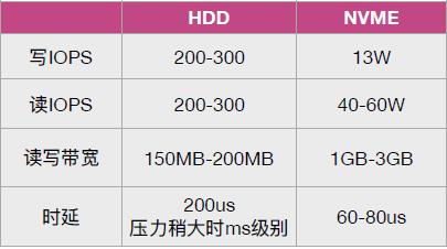 NVME充分利用 PCI-E 通道的低延时以及并行性极大的提升NAND固态硬盘的读写性能和降低时延,其性能百倍于HDD。目前常用的基于NAND的固态硬盘可支持超10W的写IOPS、40-60W的读IOPS以及1GB-3GB读写带宽,为支持NVME,软件上需要配套的优化设计。