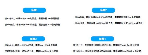 例如,同时申请100块300G的云盘,如果按1G分片,需要同时分配3W条元数据;如果按照1M分片,则需要同时分配3000W条元数据。