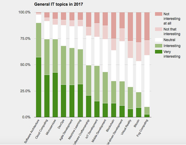 根据调查结果,云计算对于开发人员来说是一个非常相关的话题。正如人们在下图中所看到的,云计算在“通用IT主题”方面仅次于软件体系结构。