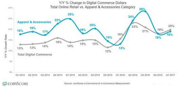 comScore数据显示,过去三年内服饰品类里数字支出有所增长,从2013年15.4%到2016年的17%。而美国消费者里20%常在亚马逊买衣服,此前有分析师预计,亚马逊服装销售将迎来爆点,今年亚马逊将超越梅西百货,成为美国最大服装销售商。