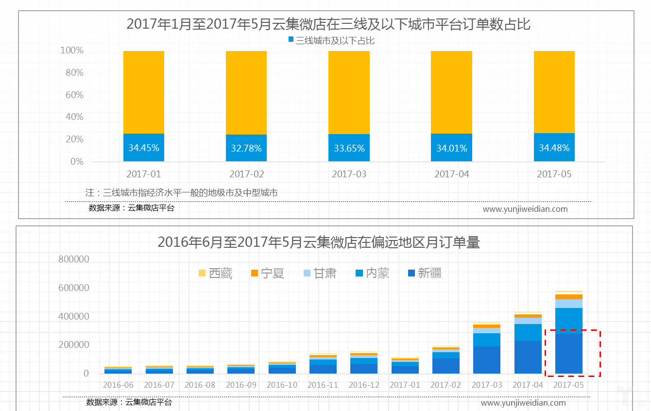 正如公布的白皮书显示,从云集微店的区域销售额分布数据来看,社交电商模式对渠道下沉的推进效果显着。销售额排名前五的省份里,位于中部地区的湖南湖北两省甚至超过了江浙两省,而来自三线以下城市的定量单占比34%,份额大大增加。