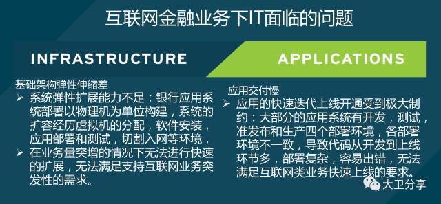 互联网金融有几个特点是:用户数量不确定性。应用个性化强、迭代快。因此互联网金融业务,对IT的要求通常有两个:弹性收缩性强、应用上线时间短。