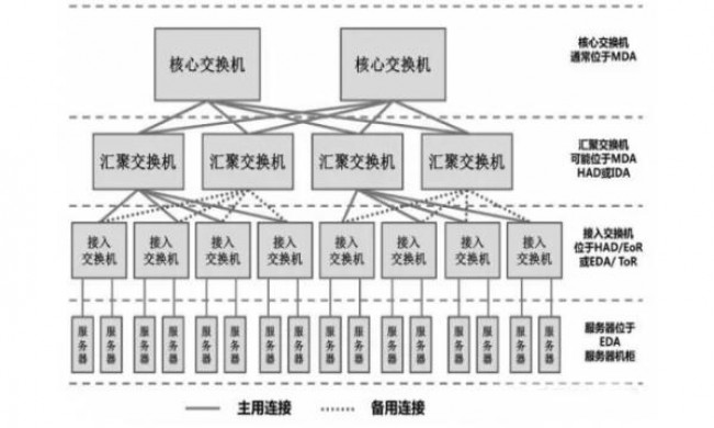 一个典型数据中心的网络架构通常由几个元素构成:设置一个或多个的进线间,采用冗余设计引入线路与通信业务联接至路由设备层,安全设备层(如防火墙等安全设备);之后,下联核心交换层,直至汇聚层和接入层交换机设备;交换机设备接入主机/服务器/小型机设备,便构成了数据中心的LAN 网络。对于存储网络SAN来说, 构成的元素较为简单:主要由主机/服务器/小型机设备、SAN交换设备及存储设备构成。主机/服务器/小型机设备下联SAN交换机设备,之后进一步下联存储设备。