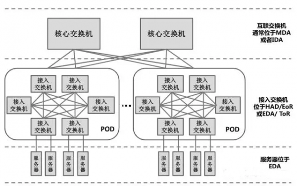 摘要:在数据中心的网络架构中,通常服务器上行端口采用 TCP IP 的协议进行数据传输,上行的整体网络层可能会包括接入层交换、汇聚层交换、核心层交换、路由等,对于这部分全部采用 TCP IP 协议进行数据传输的网络层我们可以统称为 LAN 网络,传统数据中心的 LAN 网络层如下图所示。