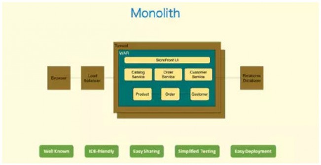 巨石架构的所有模块都捆绑在一起,进行扩展时,由于每个模块巨大,只能高成本平行整体扩容。