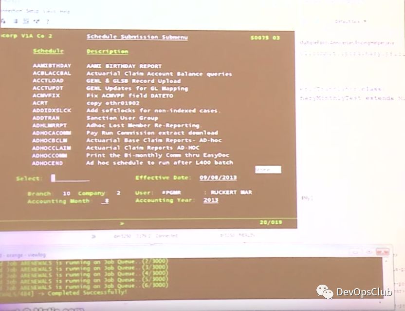 一旦端到端的业务场景中通过测试发现缺陷,必须要在数小时或数天内给出对策并解决,而不是像很多大型企业通常需要数周的时间。下图是大型机”绿屏”系统进行自动化测试的截图,出乎意料的是,执行速度非常快(笔者在数年前也开发过类似的自动化测试框架)。