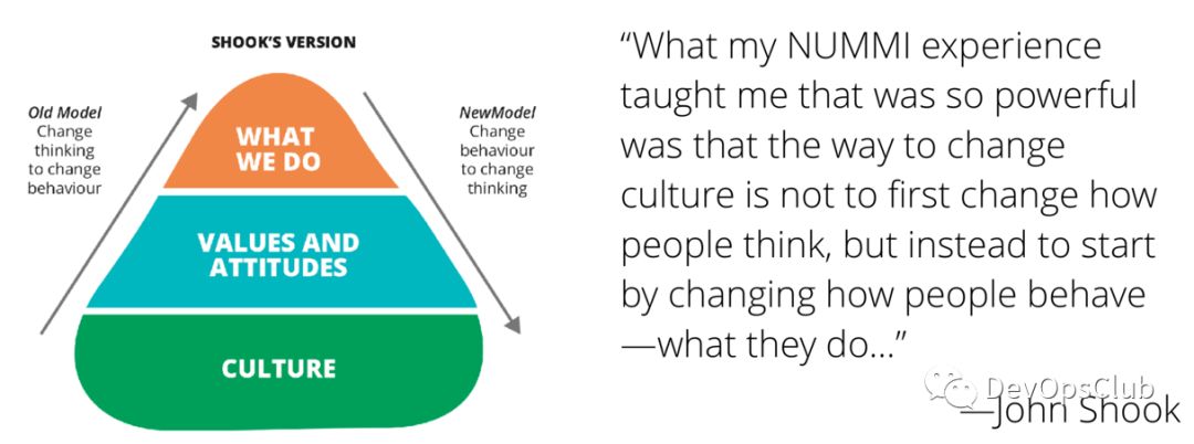 实施DevOps强调发展员工的能力及文化的因素:员工本身也许并不是问题,工作的方式和系统才是问题。要改变文化,首先要去改变的是行动方式,而不仅仅是思维方式,文化的改变是行为改变的结果。