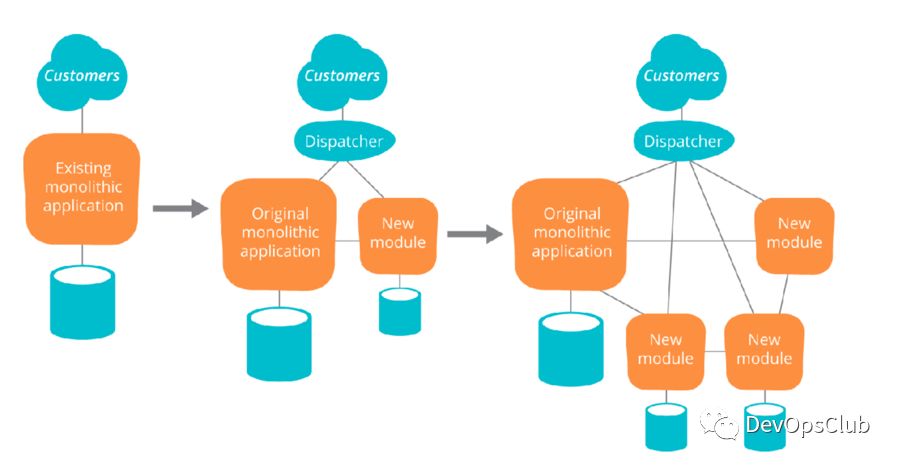 一种演进式架构的模式被称为“绞杀者模式”,单体架逐步被很多遵守SOA原则的组件所替换掉,随着时间的发展,越来越多的新功能使用新的架构实现,逐步把老的架构替换和”绞杀”。下图展示了这一模式,更多细节可以参考Matin Fowler的博客文章。