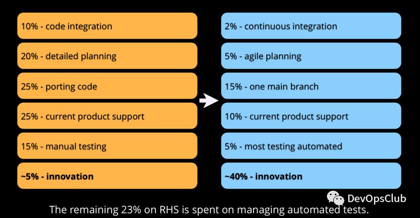 通过实施持续交付、完备的自动化测试和更加敏捷的项目管理方法后,团队的软件交付能力得到了很大提升。整体开发成本降低了约40%,能够用于创新的资源投入增加了8倍。