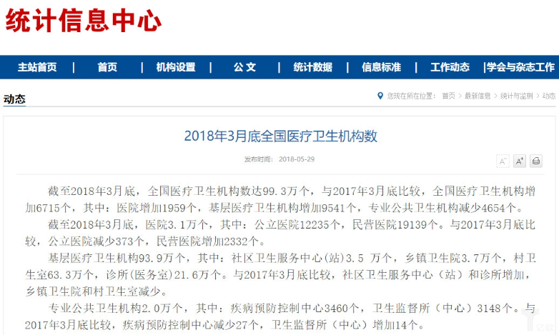 政策带动效果明显,民营医院继续扩张。截至2018年3月底,较去年同期,公立医院减少373个,民营医院增加2332个。