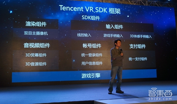 据腾讯智能设备创新中心技术总监李树欣在现场表示,虚拟现实系统特殊的架构使得内容的设计不再需要依赖硬件本身,而是倚靠于公共的开发平台,且大多直接采用游戏引擎开发。基于此,腾讯所提供的Tencent VR SDK也是一个打通多个领域的通用方案——以Unity、Unreal游戏引擎为基础,Tencent VR SDK组件涵盖了渲染、音视频、输入(线控、游戏手柄和3D体感手柄)、账号、支付等多个方面。