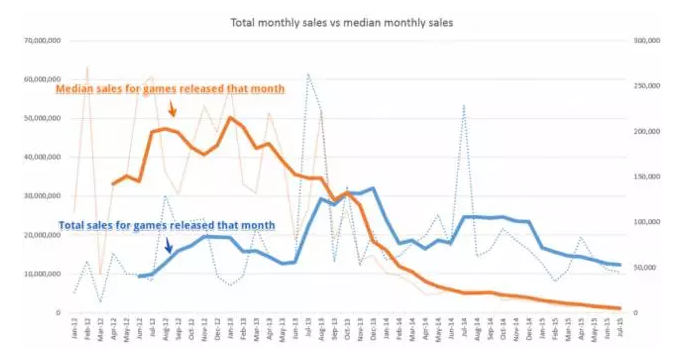 B. 随着Steam开闸放水,越来越多的游戏在上面上架,你可以从图表当中看到,橙色曲线从2013年底开始大幅向下,但这种下滑是可以理解的:如果你在Steam上架了大量廉价游戏和老游戏,其每款游戏的平均销量自然被拉低了,这一结果并不令人惊讶。