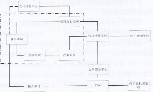 图1中的支付内容平台是指提供商品或服务内容的平台;远程支付系统为远程支付提供移动终端接入、交易信息及结算数据的处理等功能;收单系统负责联机交易信息的产生和转接以及结算数据的收集、整理和提交等;转接清算系统实现跨机构支付的业务转接、清算和结算功能;账户管理系统为银行卡账户或非银行卡结算账户提供资金管理、结算等业务;接入渠道指短信、OTA及专用终端等接入方式;TSM(可信服务管理)是负责移动支付安全单元管理及应用生命周期管理的实体;应用提供方系统提供各种移动支付应用;公共服务平台是移动支付参与各方认可的可信第三方系统,提供机构注册接入、应用注册、跨TS M交互转接、SE可信管理、SE开放共享功能、应用共享等功能。