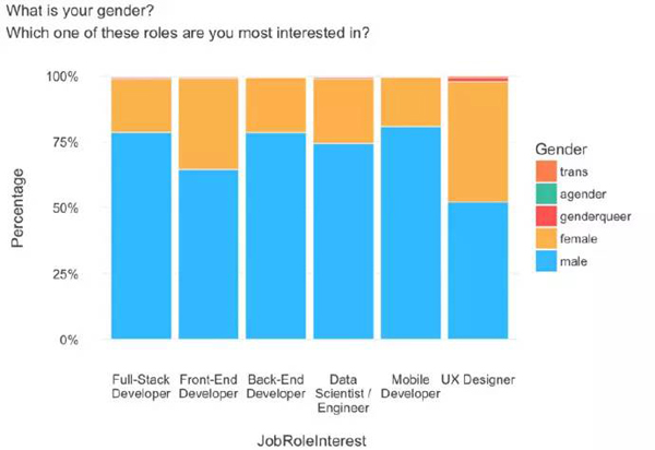 从性别来看,用户体验设计师是多样性最高的职业,52%男性,46%女性,还有最高的中性人、跨性别和变性人群(2%)。移动应用工程师是最男性主导地位的职业,全栈工程师和后端工程师的男性比例也很接近。