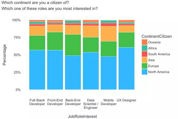 相对而言,女性更倾向于用户体验设计。亚洲、南美和非洲更倾向于从事移动应用开发。数据科学家/工程师和移动开发者分别占据了教育程度的高端和低端。