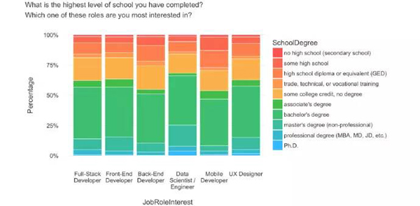 数据科学家和数据工程师是拥有大学学历最多的人群。移动应用开发人员有很多没有什么学术背景或者仅仅只有高中学历,后台开发人员紧随其后。