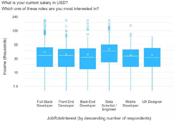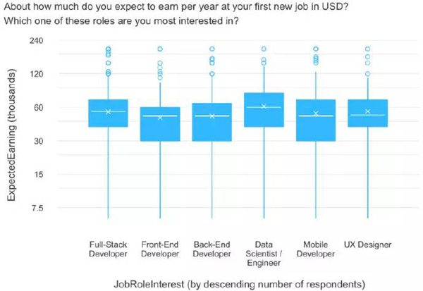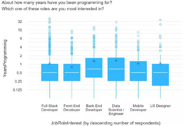 数据科学家,数据工程师,仍在培训阶段的后端开发人员有最长的开发经验中位数——八个月。用户体验设计师的25%中位线是最低的——比前面提到的人群少了两个月——一共也才两个月。编程经验有很多大值异常以致于一些平均值都大于75%分位数。