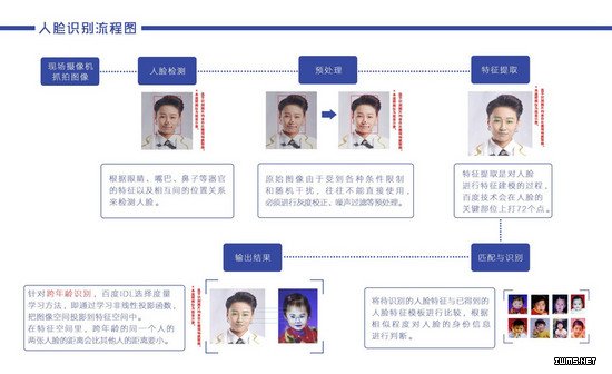 百度目前用的也是深度学习的方法,林元庆介绍:“我们会把人脸分成七个部位,在这七个部位上学习哪些特征是非常重要的,不是人来挑选的,是人自动学习的,我们会收集这些数据,收集完之后告诉机器这个人小时候长这样,这个人大了长这样,让机器自己去学,哪一些特征是非常重要的特征。”