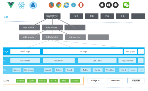 而组件与模块另一个价值——粒度控制,需要在运行前进行粒度拆分,拆分后最细的粒度是UI, 而在架构上,CORE和Bridge JS、增量更新等也是不可忽略的一部分。