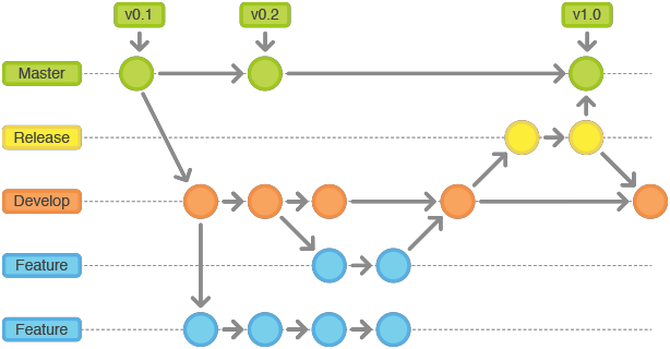 在Git-flow的分支模型中,有两个主分支master和develop,还有几个额外的分支来支持代码的版本管理。下面先简要介绍一下这些分支的特点。