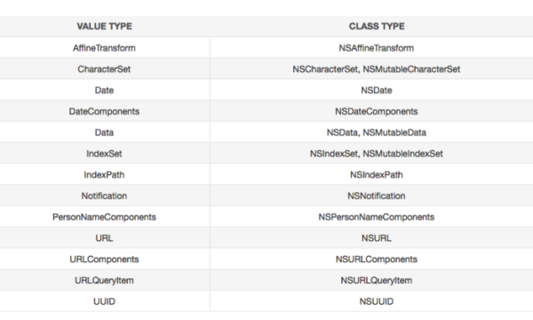 除此之外,Swift和OC还有其他的类型对应,对应关系如下:
