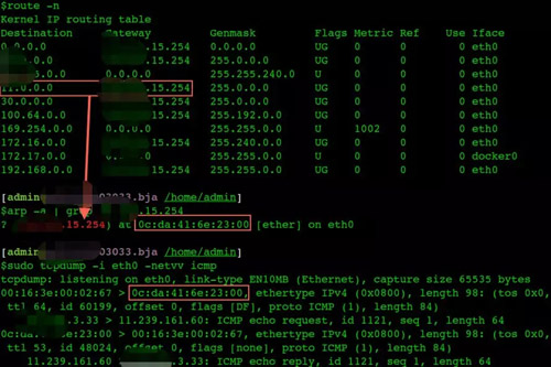 首先是目标IP 11.239.161.60 符合最上面红框中的路由规则,又不是同一子网,所以查找路由规则中的网关1.1.15.254的Mac地址,arp cache中有,于是将 0c:da:41:6e:23:00 填入包头,那么这个icmp request包就发到1.1.15.254上了,虽然包头的mac是 0c:da:41:6e:23:00,但是IP还是 11.239.161.60。