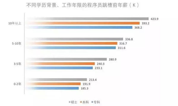 从跳槽前平均薪资数据中,我们发现本科生虽然在面邀邀请数量上超过了专科生,但薪资却几乎没有拉开差距。在工作的头10年中,随着职场阶段的深入,专科程序员与本科程序员之间的差距不断缩小。因此,从后发优势的角度,专科程序员和本科程序员区别不大。