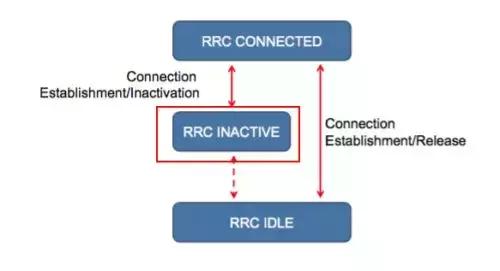 在这里有必要补充一下,相较于4G LTE只有RRC IDLE和RRC CONNECTED两种RRC状态,5G NR引入了一个新状态——RRC INACTIVE。