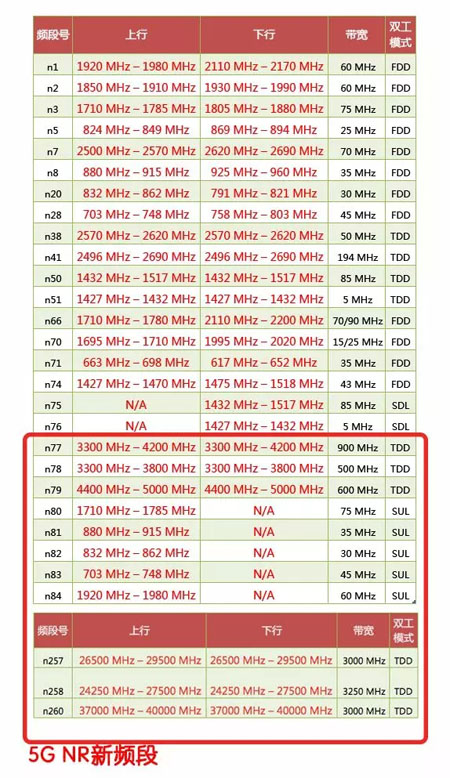 在R15版本中,5G NR定义了从sub 6GHz到毫米波的多个频段范围,如下图: