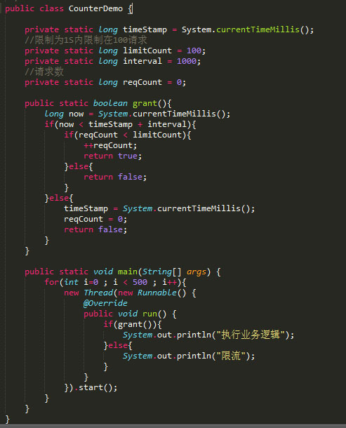 计数器是一种比较简单的限流算法,用途比较广泛,在接口层面,很多地方使用这种方式限流。在一段时间内,进行计数,与阀值进行比较,到了时间临界点,将计数器清0。