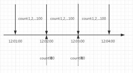 这里需要注意的是,存在一个时间临界点的问题。举个栗子,在12:01:00到12:01:58这段时间内没有用户请求,然后在12:01:59这一瞬时发出100个请求,OK,然后在12:02:00这一瞬时又发出了100个请求。