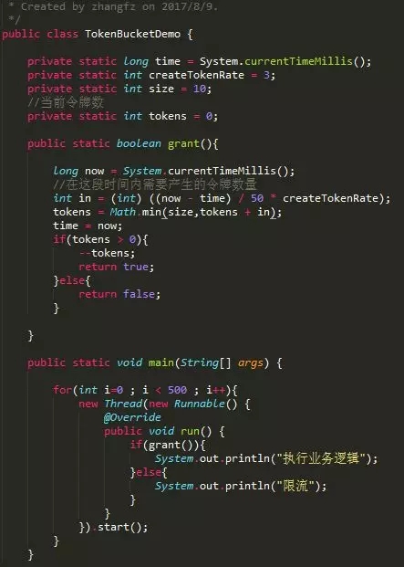 生成令牌的速度是恒定的,而请求去拿令牌是没有速度限制的。这意味,面对瞬时大流量,该算法可以在短时间内请求拿到大量令牌,而且拿令牌的过程并不是消耗很大的事情。(有一点生产令牌,消费令牌的意味)