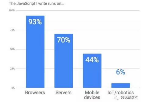 从使用范围上看,JavaScript 可以写前端、服务端、移动端,甚至还可以写物联网应用。在 npm 2018 的调研报告中,大多数 JavaScript 开发者*写 web 前端应用(93%)和 node.js 服务端应用(70%)。在 stateofjs 2018 的调研报告中,还有相当数量的 JavaScript 开发者*写移动或桌面应用,例如 Electron(19.6%)、React Native(18.7%)、Native Apps(10.6%), Flutter 、Weex、PWA 都在 1% 以内。