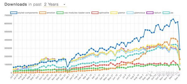 图六: npmtrends.com CSS in JS 方案下载量对比