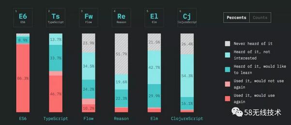 值得注意的是,TypeScript 在 2018 年得到更多开发者的青睐。在 github 语言排行版中,TypeScript 上升了 3 名,排到了第 7 的位置。在 stateofjs 2018 的调研报告中, JavaScript 开发者有 86.3% 愿意继续使用 ES6,有 46.7% 愿意继续使用 TypeScript。排在第三、四的是 Facebook 的 Flow 和 Reason 语言,但是占比都不高。