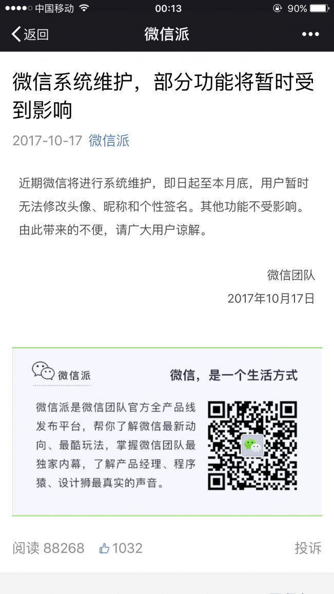 近期微信将进行系统维护,即日起至本月底,用户暂时无法修改头像、昵称和个性签名。其他功能不受影响。由此带来的不便,请广大用户谅解。