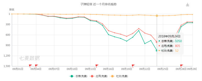 据报道,9月27日子弹短信上线一个月有余,下载量估算已从8月28日 最高峰值的56 8万跌至5960,不及一个月前高峰时期的百分之一,据此判断子弹