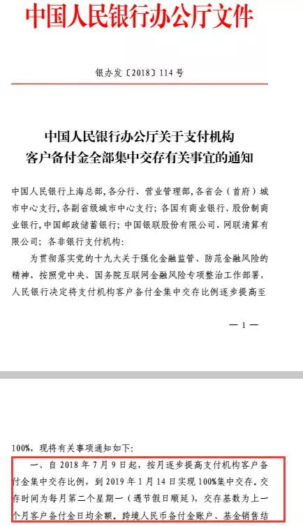 日前,央行发布通知,宣布将支付机构客户备付金集中交存比例逐步提高至100%。这是国务院部署的互联网金融风险专项整治工作的主要内容之一,也