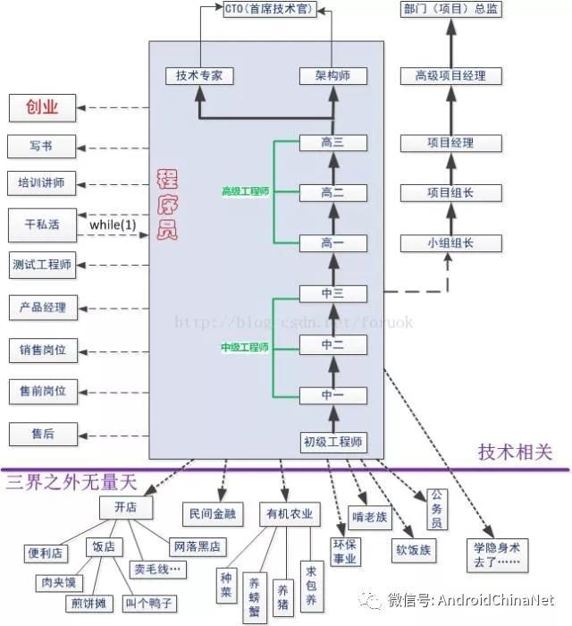 最近在琢磨程序员到底路在何方,经过不断的自虐和代入,终于在迷雾森林中得图一张,看之豁然开朗。独乐乐不如众乐乐,share了。