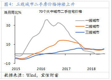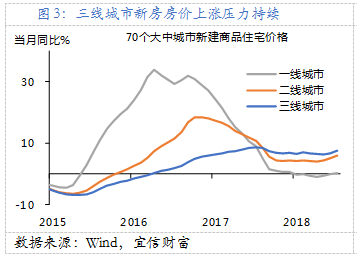 快速去库存的一个副产品就是高房价,2016年以后三线城市房价上涨压力持续,而一线城市房价相对平稳。