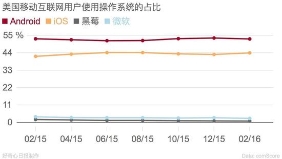 iPhone 卖少了不是说用户都换了 Android。事实上在美国之类的成熟市场,iOS 的市场份额反倒比一年前更高了: