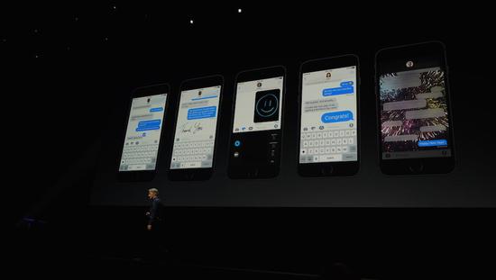 但在这样紧凑的一个发布会上,互联网服务还是分到了 1/6 时间。当中 15 分钟给了 iMessage,三位高管上台介绍它的功能;另有 5 分钟给了大改版的 Apple Music。