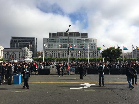 而昨天的发布会也像系列大作上映前一样:狂热的粉丝带着帐篷提前一天在旧金山的寒风中等待开场。发布会前几小时,数千参会者挤满了比尔·格雷厄姆市政礼堂前的广场,像极了《星球大战 7》上映前的粉丝集会。