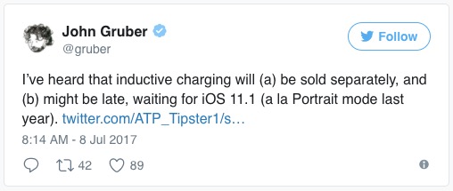 格鲁伯在推文中称,他听说无线充电器将与新iPhone手机分开单卖,这一消息也和此前其它报道一致。另外,他表示,新充电技术“可能会迟到”,直到iOS 11.1发布后才会上线。
