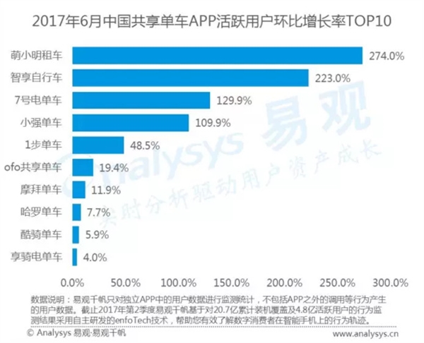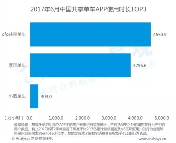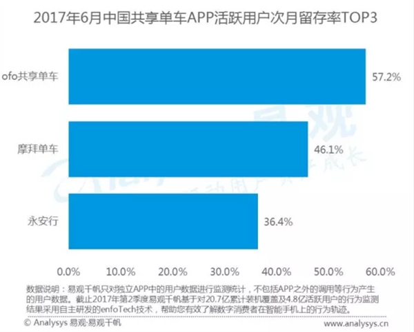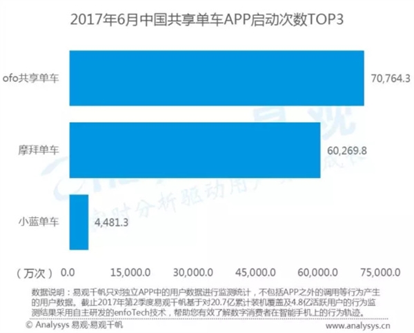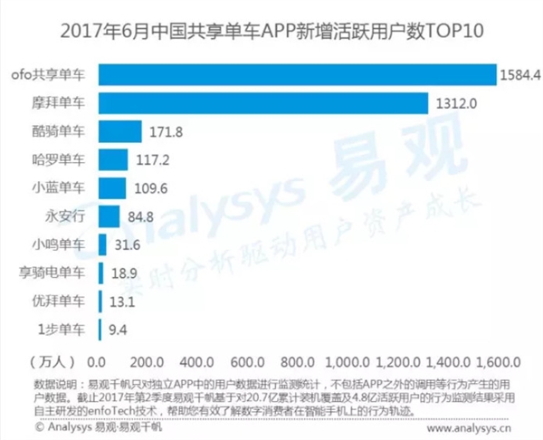 与此同时,2017年6月,ofo共享单车、摩拜单车、酷骑单车则分别以1584.4万人、1312.0万人、171.8万人占据中国共享单车APP新增活跃用户数前三。