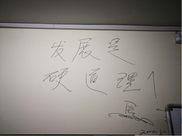 图:湖畔花园墙上挂着马云亲自书写的“发展是硬道理!”