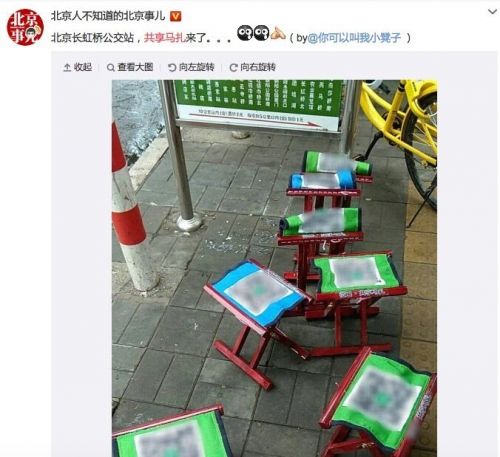 日前,有网友晒照,在北京东三环长虹桥北公交站看到惊现共享马扎,其与普通马扎没什么区别,只是多了一个二维码。但不到一天时间,摆放的